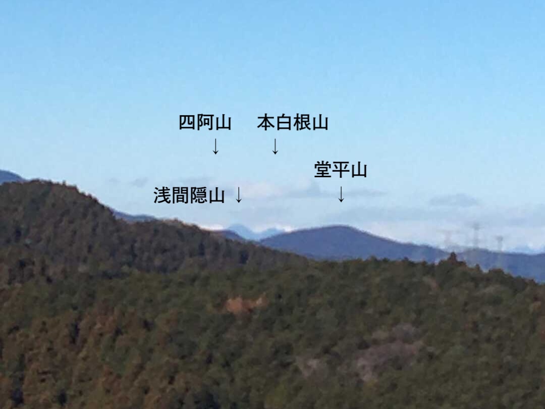 ![]() 堂平山の左肩の遠方の三角の山がおそらく浅間隠山。その右の雪山が草津白根辺り、左は四阿山辺りと思われます。 |